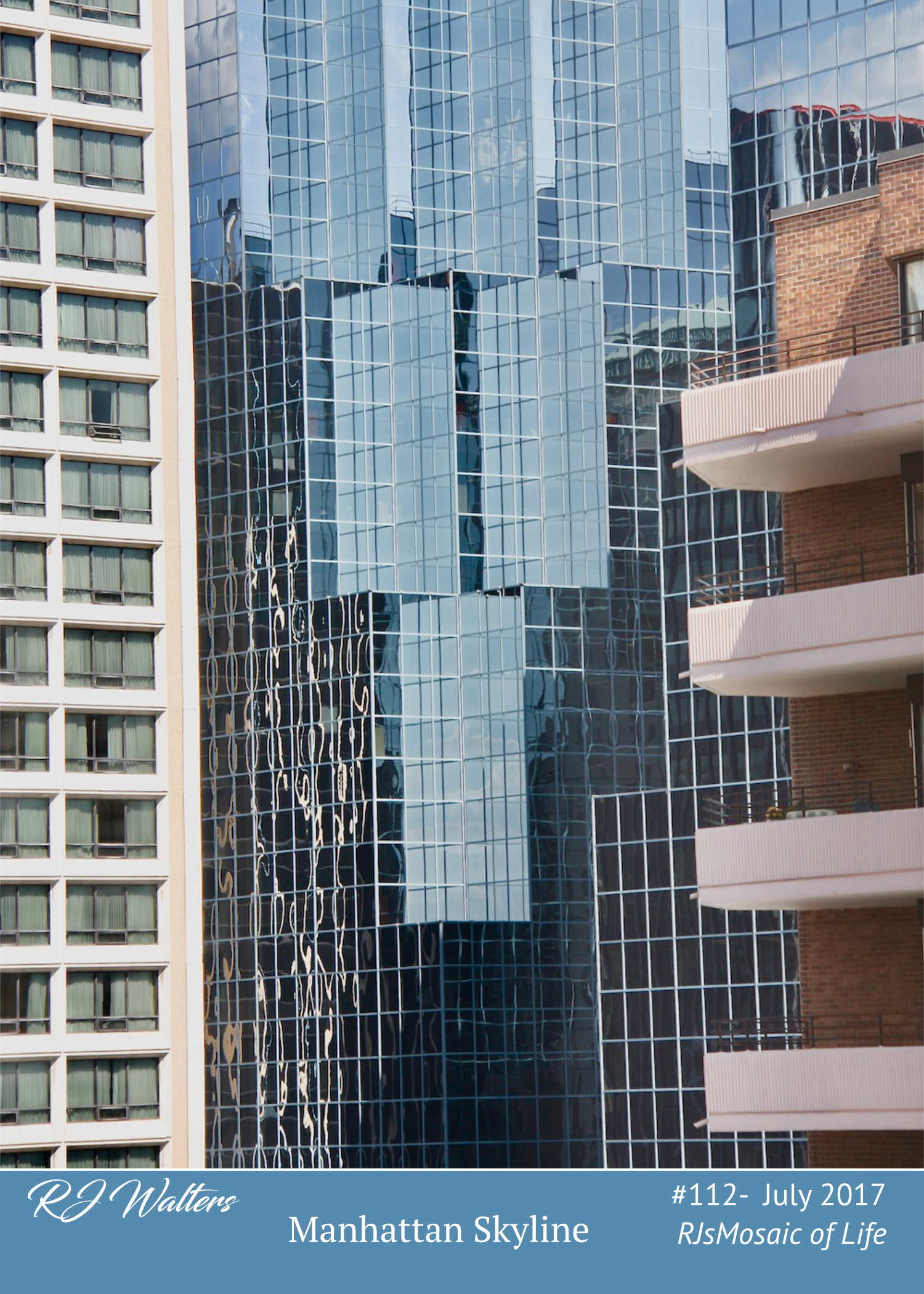 I titled this mosaic “Manhattan Skyline” but there is really no skyline in the picture, except maybe as a reflection. I have been going to Manhattan for 70+ years now. In the early days is was to go to corporate headquarters or other business type trips. In the last 25 years is has been part of a vacation experience.