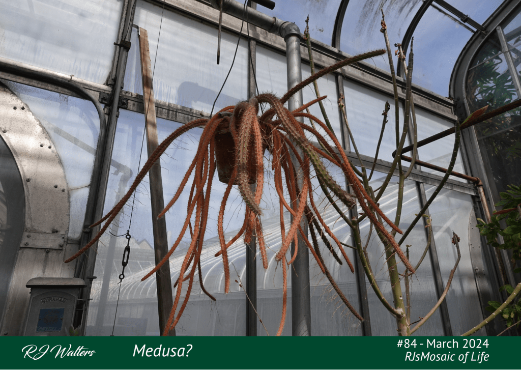 I don’t know if the above plant is some sort of Medusa or if it is just dead? Either way is just fine with me. BTW… I purposely took the pic with all the infrastructure in the background. That shows that it is a working greenhouse. I like that.