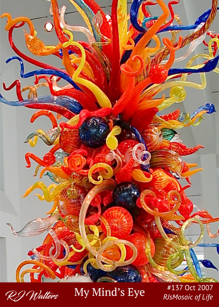Anyway, the picture above is what my mind’s eye saw as what my cluttered mind looks like on a typical day. The glass sculpture was in the lobby of the Milwaukee Art Museum in 2007. It is about 12 ft tall and probably 5 ft wide. When I walked in the door, I saw nothing else for in unimaginable period of time.
